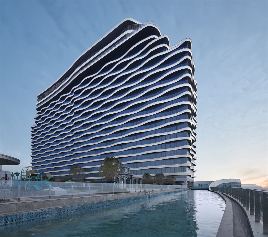 长沙融创施柏阁旅馆群地处长沙市有中心城区“东大门”之称的黄兴片区,坐拥空铁一体化立体式交通枢纽优势,所属区域交通便当,自然情形优美,水网交织,生长空间富足。设计借力高铁东城生长战略,深入挖掘地区人文资源,以得天独厚的自然景观资源为依托,力争将自然景观与历史遗产相团结,以“人文生态峡谷”为主题,打造具有地区特征、现代活力、自然生态型的都会花园度假旅馆。同时,团结外部景观及内部功效属性设置6000方,高度约21 米的共享大堂,且在共享大堂中设置具有外地特点的修建集群及小桥流水的景观,打造“城中城”的空间体验;共享大堂屋顶设置超标准空中花园与浏阳河遥相呼应;邮轮式修建体量,双无边泳池及“水波纹”的修建造型配合塑造了长沙高铁新城片区新的都会地标和网红基地。