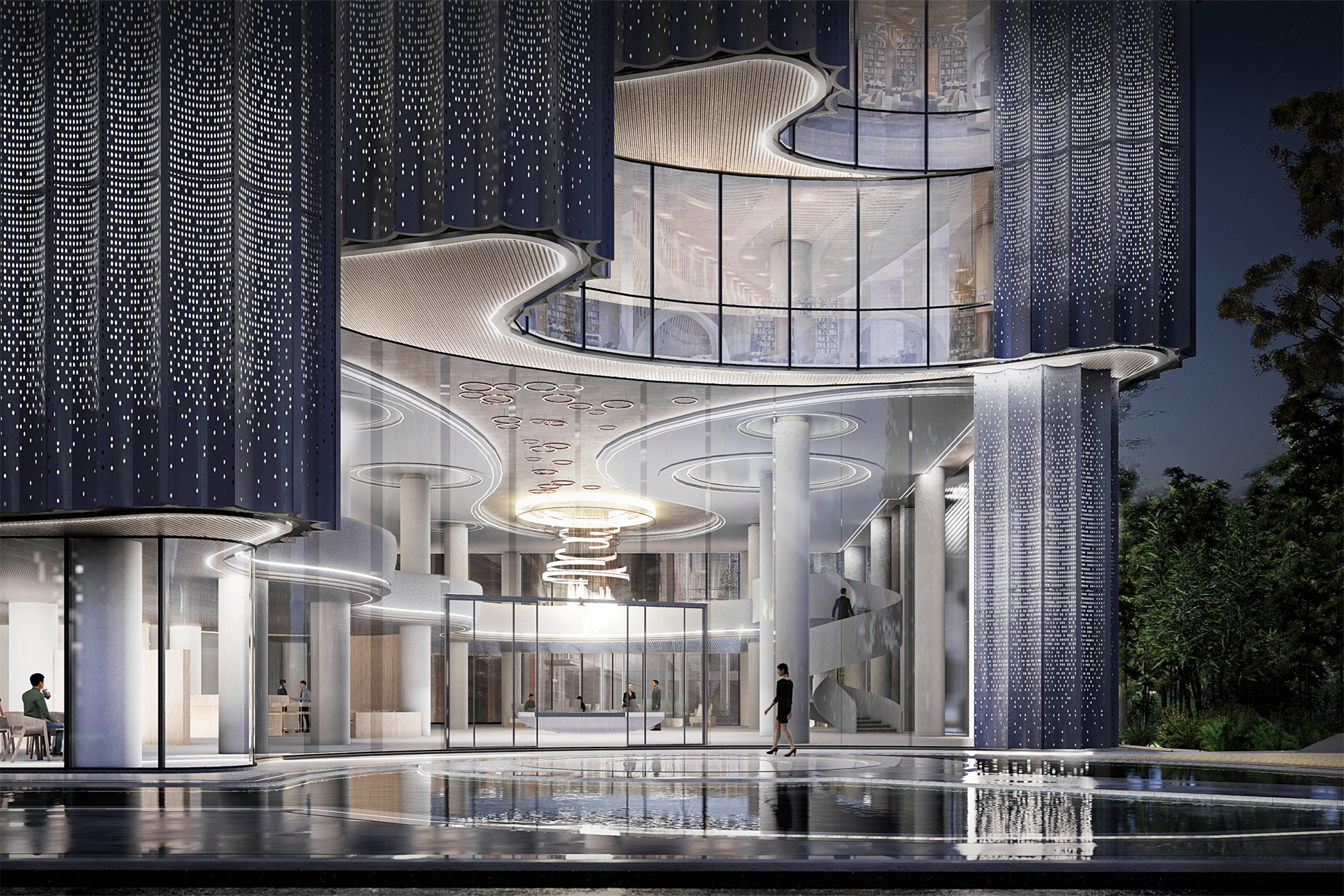 济南历城区浪潮智能盘算工业园B1、B2地块展示中心位于济南历城区焦点开发区域,基地西临唐冶中路、北临横四路,南靠横五路,同时沿唐冶中路的轨道交通4号线在建,交通便当。周边多为新建住民区,生齿大宗导入,对商业需求大;办公市场大多是公寓、商墅产品配少量办公。本案前期作为展示中心使用,后期将作为独栋办公楼出售。设计以“浪”为设计理念,接纳铝板幕墙模拟浪型,包裹修建,让修建犹如璞玉一样平常逐渐展露。因就“浪水”是一层一层的,以是在单体造型上,设计使用退台的效果来模拟“浪花”的形状,并在入口处搭配通高的玻璃幕墙,精练清透,犹如潮流退去,璞玉渐露,在阳光下晶莹剔透。